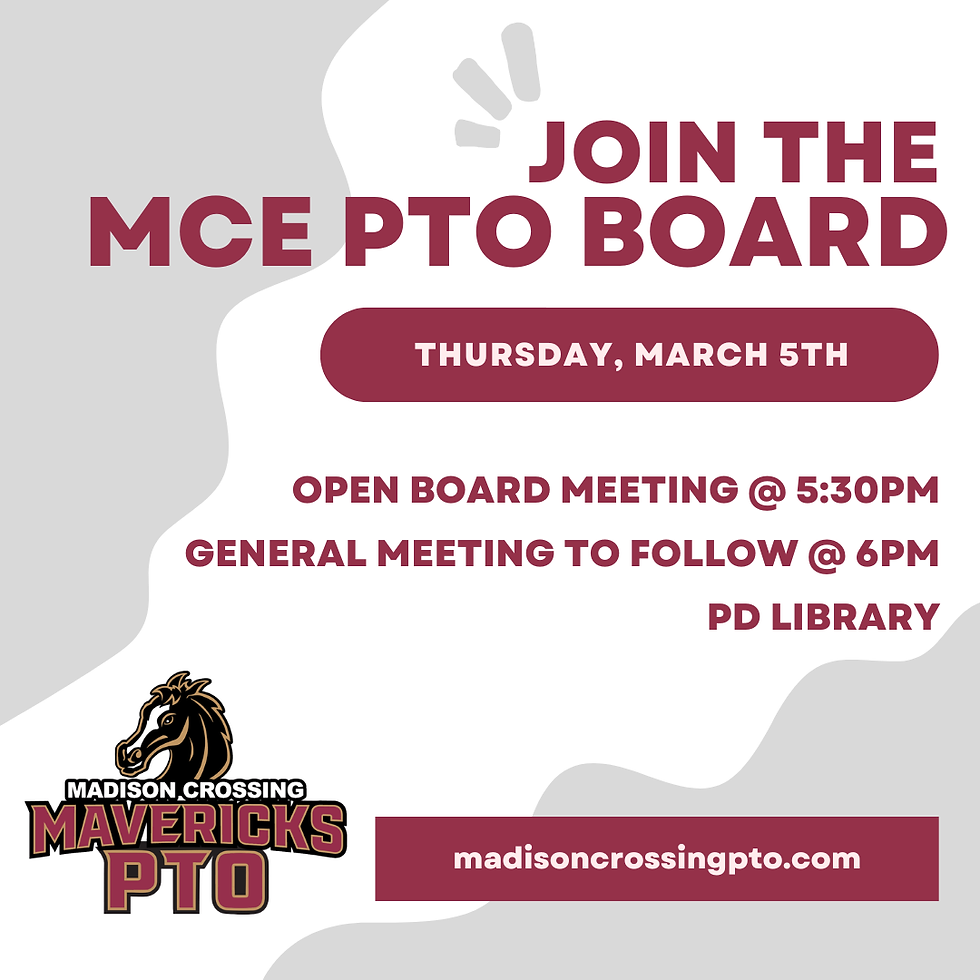 Interested in joining the PTO Board for 2026-2027 school year? We invite you to join us for our March board meeting Thursday, March 5th @ 5:30pm to chat with our current board and see where you can plug in for next year! Our general PTO meeting will begin at 6pm.